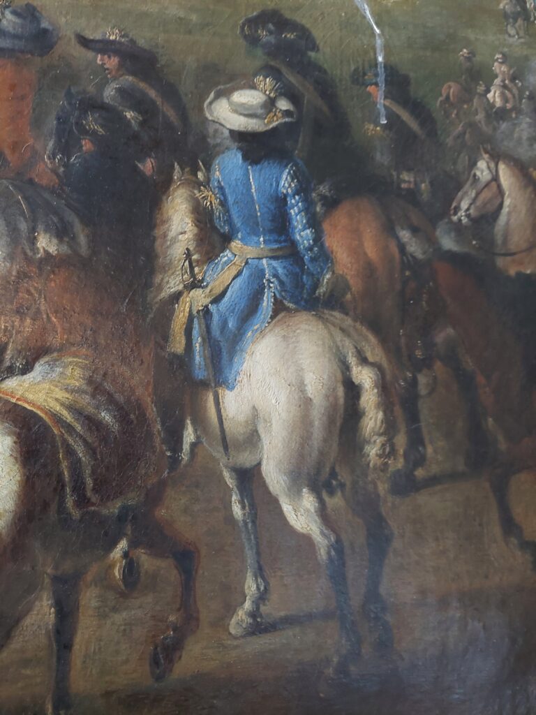 Den ljusblå ryttaren bör ha tillhört antingen Drabantkåren eller Livregementet till häst. Notera dock att det är endast på den här målningen som den blå uniformsfärgen har en så pass ljus nyans. På övriga målningar är den mer mellanblå. Dessutom är det endast i förgrunden som ryttarna har blå rockar. I slaguppställningen som syns i bakgrunden på Lemkes målningar är kavalleriregementena alltid avbildade med gula kyller istället för klädesrockar.