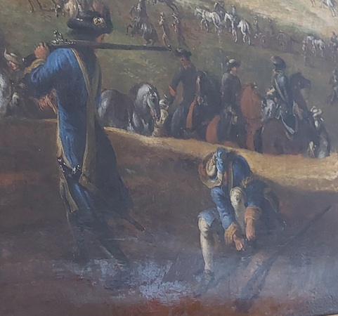 Men ficklock var som sagt något som Lemke nästan helt utelämnade när han avbildade soldater. Nedanstående detalj från en målning föreställande slaget vid Lund var det enda stället som jag lyckades hitta ficklock.